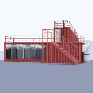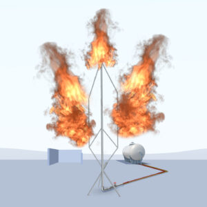 Estructura metálica de 4 metros donde se simula una fuga de gas, generando un fuego de clase C de gran dimensión. En este módulo se practica el desplazamiento coordinado de la brigada contraincendios, con mangueras y pantalla de protección, para poder extinguir el fuego mediante el cierre de la válvula, por eliminación del combustible.