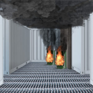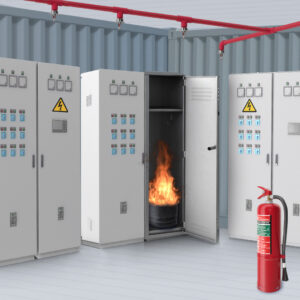 Conjunto de cuadros eléctricos industriales situados en el interior de una infraestructura cerrada y ventilada, donde se simulan conatos de incendio. Los cuadros eléctricos están dispuestos con objeto de plantear diferentes estrategias de ataque y extinción mediante sofocación con el uso de extintores de CO2.